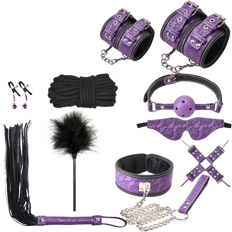 Package: Whip*1, oral ball*1, eye mask*1, ankle guard*1 pair, handcuffs*1 pair, nipple clamp*1 pair, collar*1,Ropes 10m*1, Teasers*1, Cross buckle*1