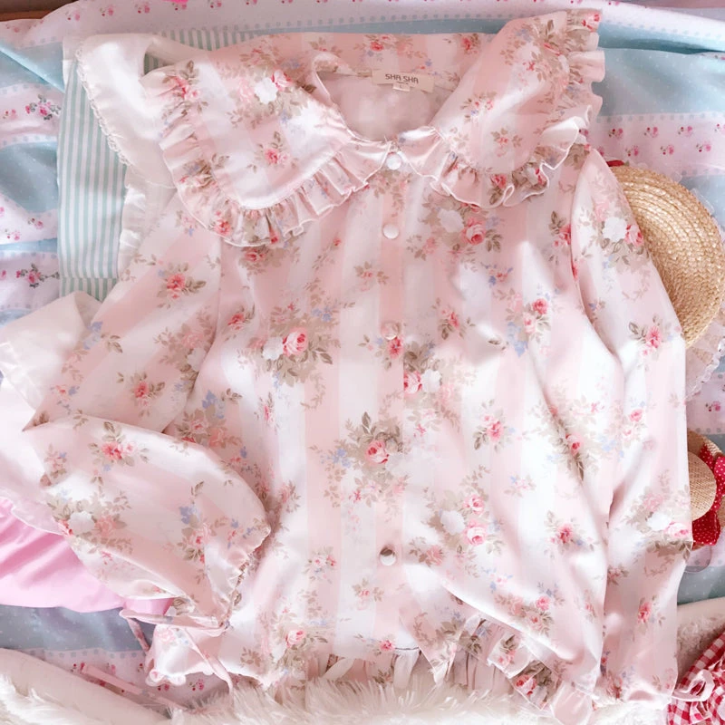 Spring Pink Flower Blooming Babydoll Collar Ruffle Aesthetic Shirt